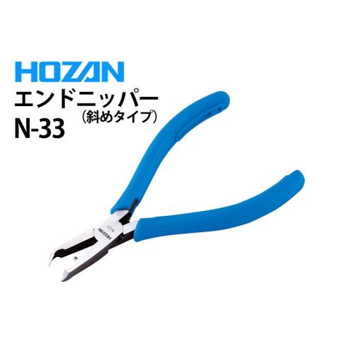刃先が斜めタイプのエンドニッパー「HOZAN N-33」です。この「N-33」は"喰い切り"と"斜ニッパー"を合いの子にしたようなニッパーで、精密基板上の配線カット・部品の切断などに重宝します。また、手になじむエラストマーグリップと、バネ付き手放し開放型により連続した作業でも疲れにくい設計です。